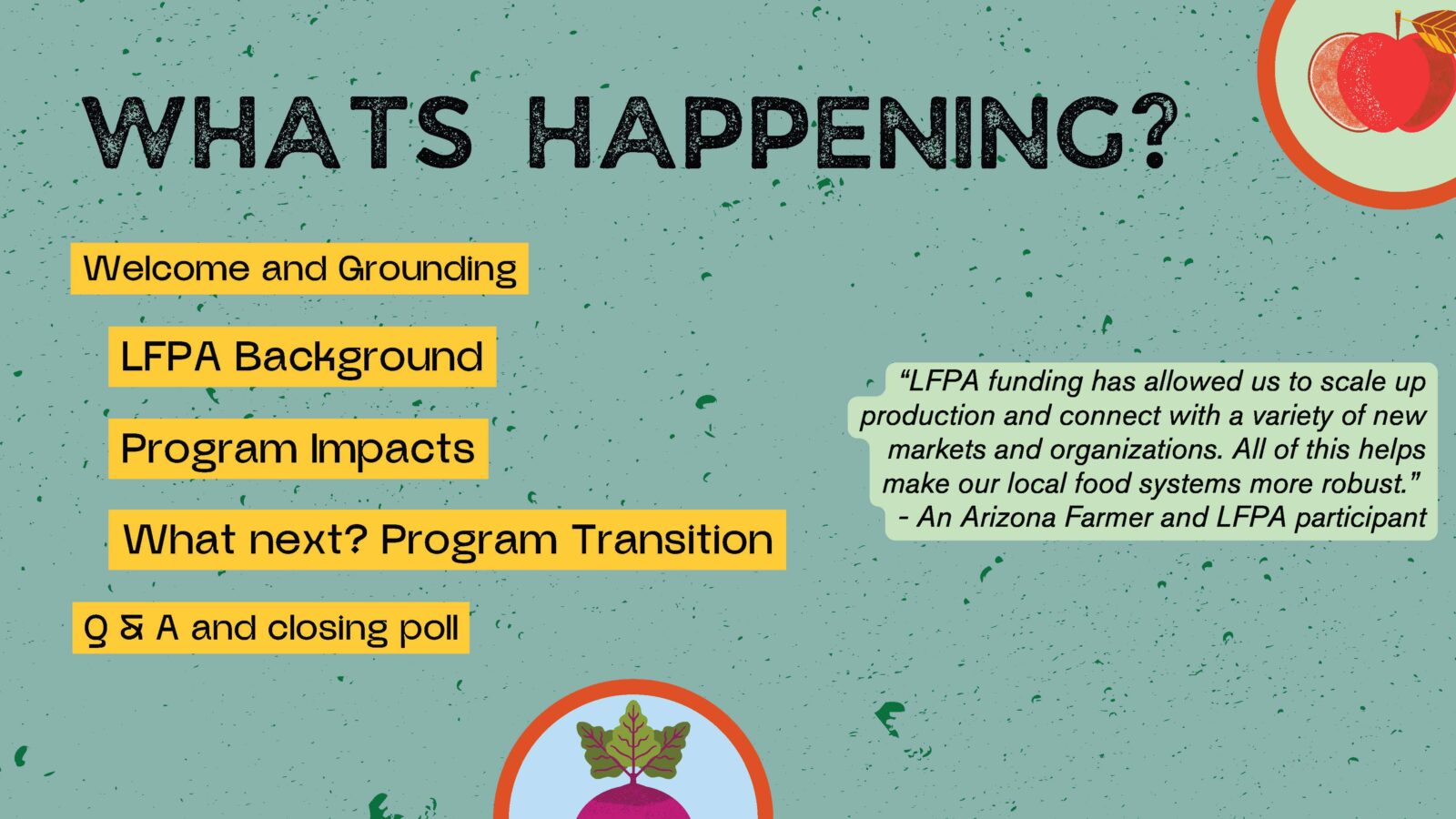 For two years Friends of the Farm and Purchase Local AZ have hosted an annual live webinar to share updates about LFPA-funded projects across the state; to celebrate successes and share lessons learned, as well as what’s next in local food procurement and farm-to-food assistance programming in Arizona. Check out this and previous years’ slides below.