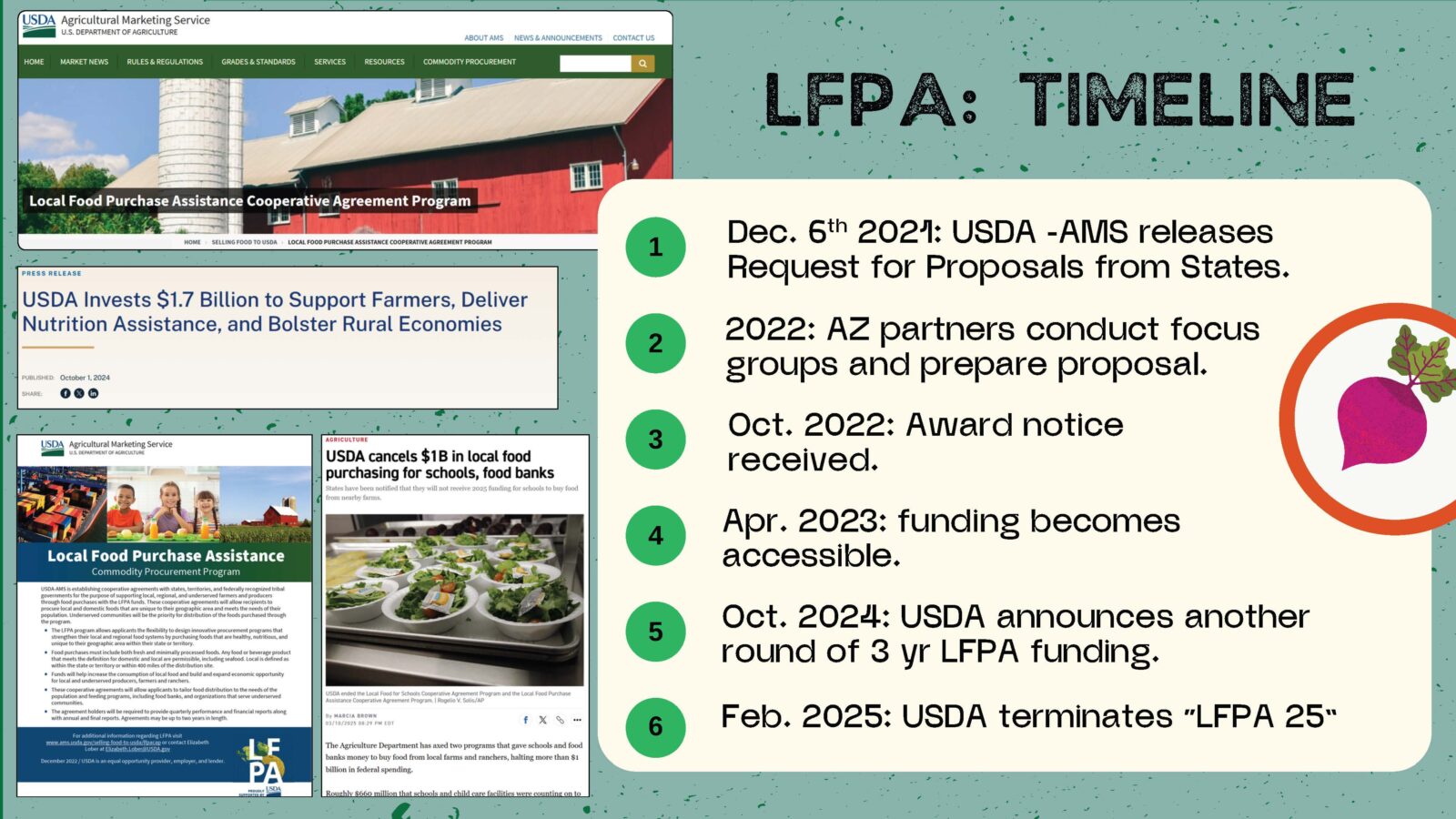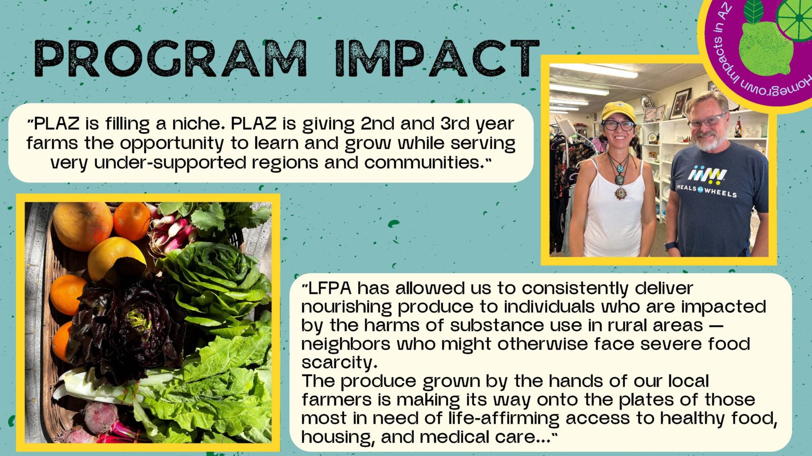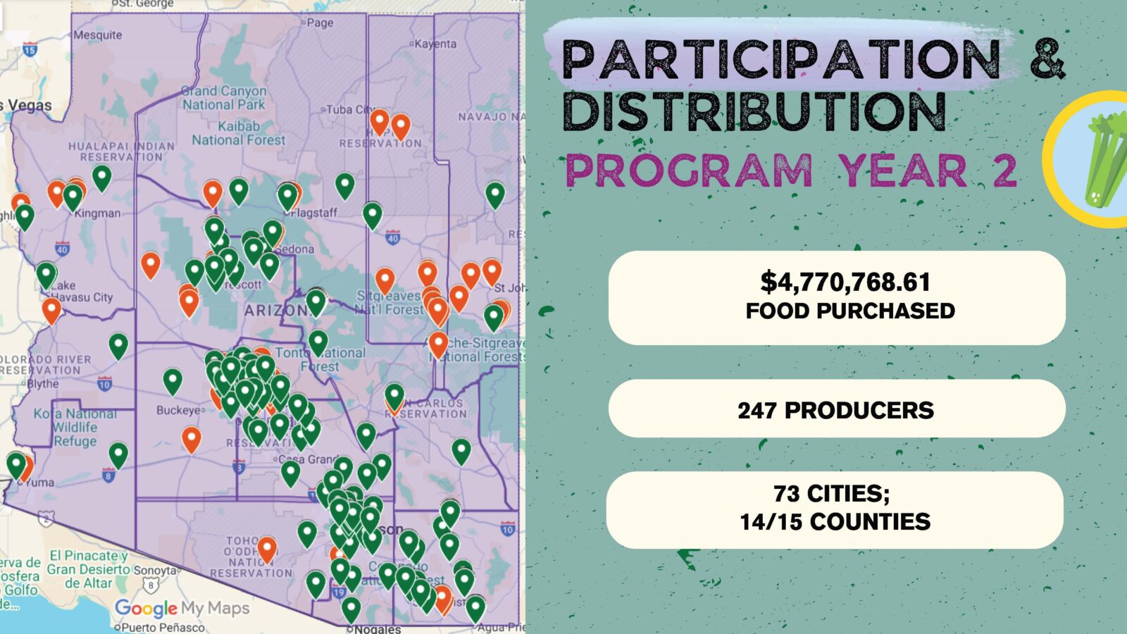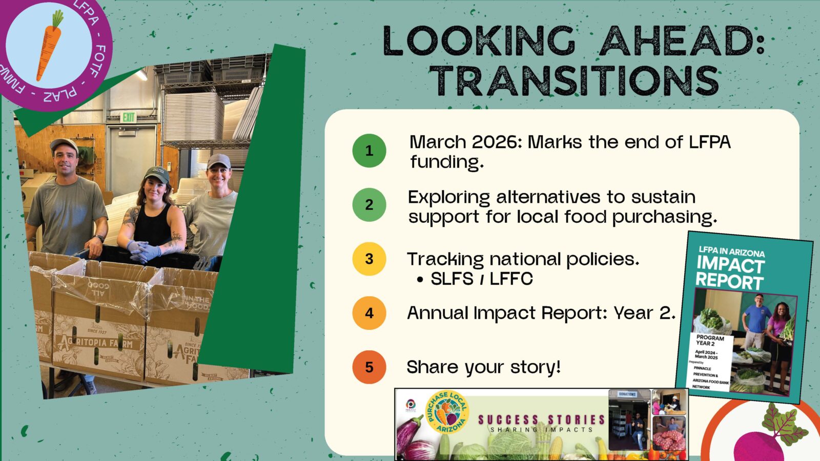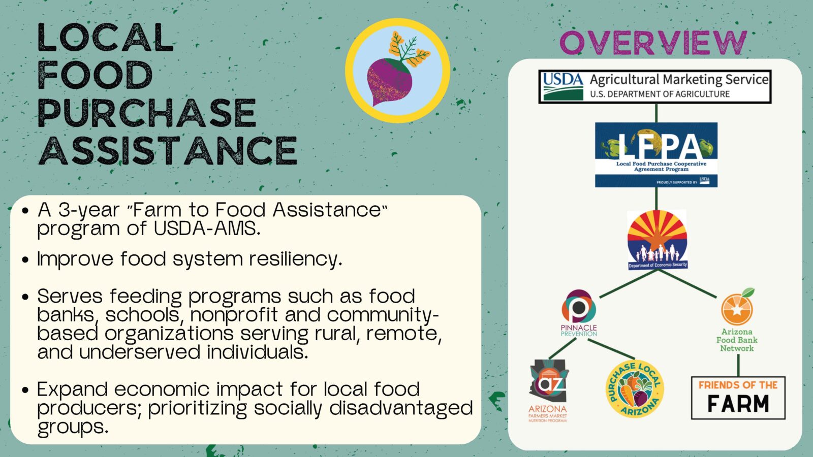 11/19/2024: Check out our progress and accomplishments during the first year-and-a-half of LFPA funding in Arizona. Learn how Pinnacle Prevention and the Arizona Food Bank Network have deployed the Friends of the Farm and Purchase Local AZ programs to connect Arizona farmers, ranchers and food producers with food assistance programs across the state!