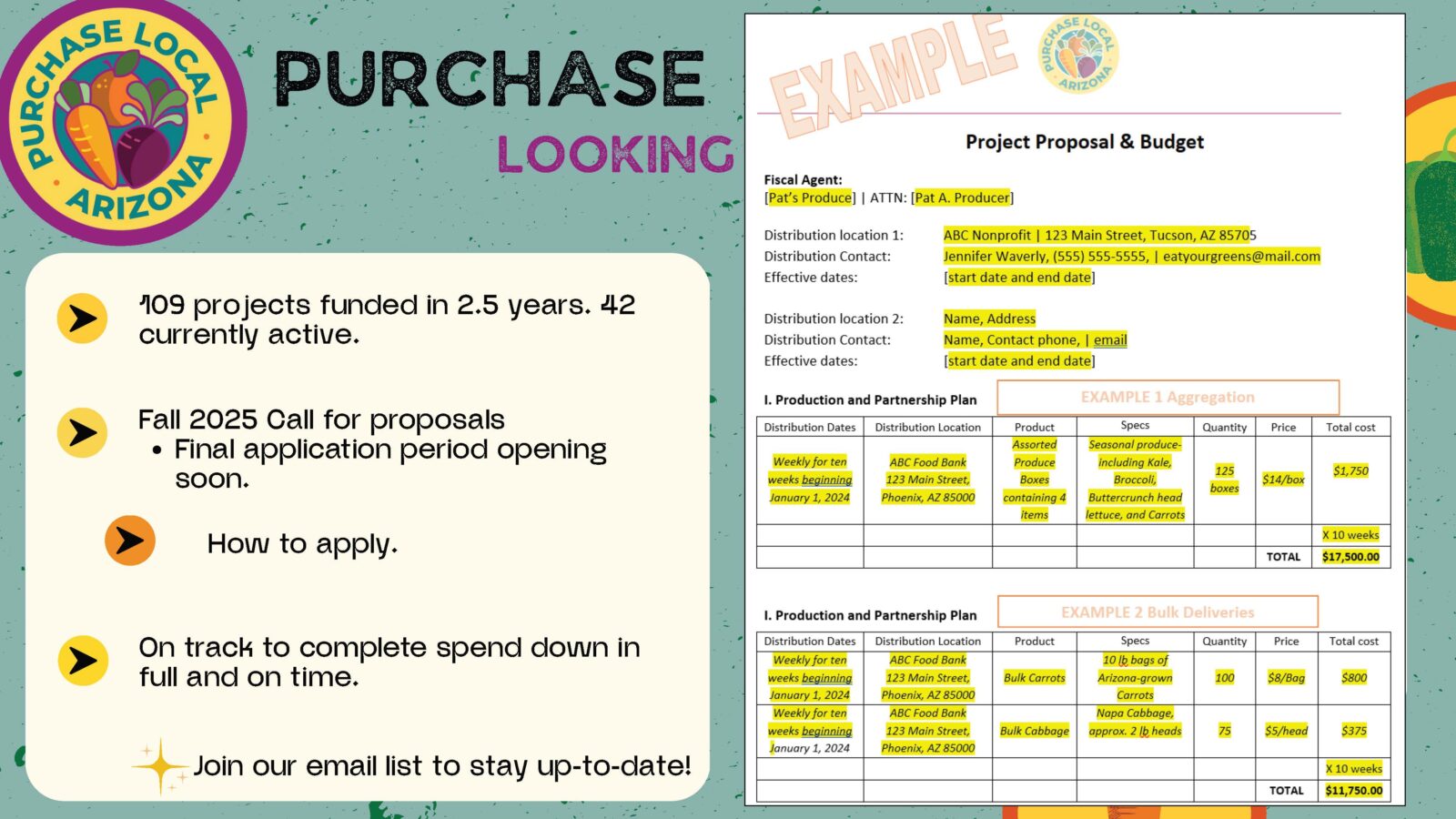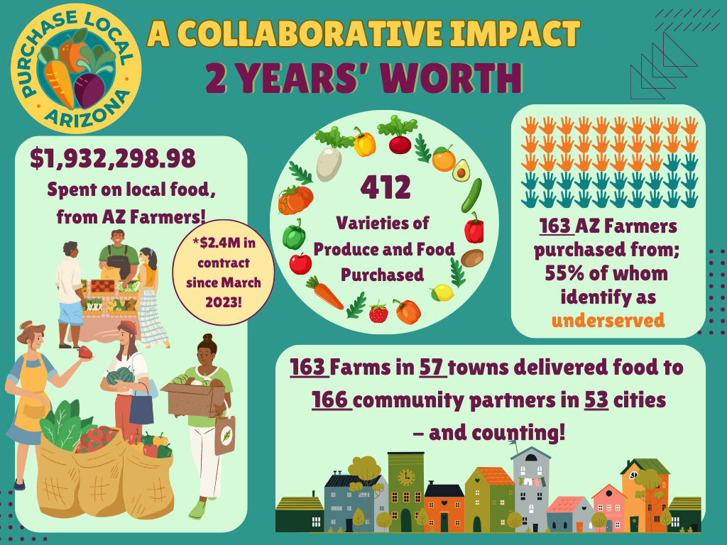 Through 2025, Purchase Local Arizona will strengthen local and regional food systems by working collaboratively with food producers, aggregators, distributors, food security organizations, food banks & pantries, and tribal partners and help underserved communities in Arizona get nutritious, seasonal, Arizona grown food.